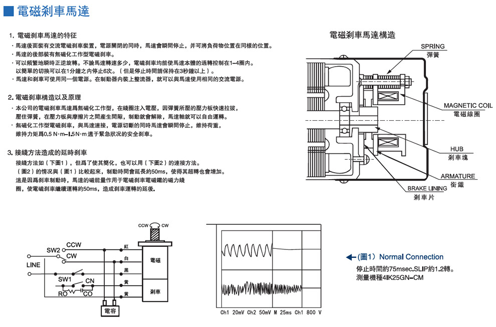 概述:1、马达后面装有交流电磁刹车装置,电源关闭的同时,马达会瞬间停止,并可将负荷物位置在同样的位置。 2、马达的后部装有无磁化工作型电磁刹车。 3、可以频繁地顺时正转逆转。不论马达转速多少,电磁刹车均能使马达本体的过转控制在1— 4圈内。 以简单的切换可以在1分钟之内停止6次。(但是停止时间请保持在3秒以上)。 4、马达和刹车可使用同一个电源。在制动器内装上整流器,就可以与马达使用相同的交流电源。